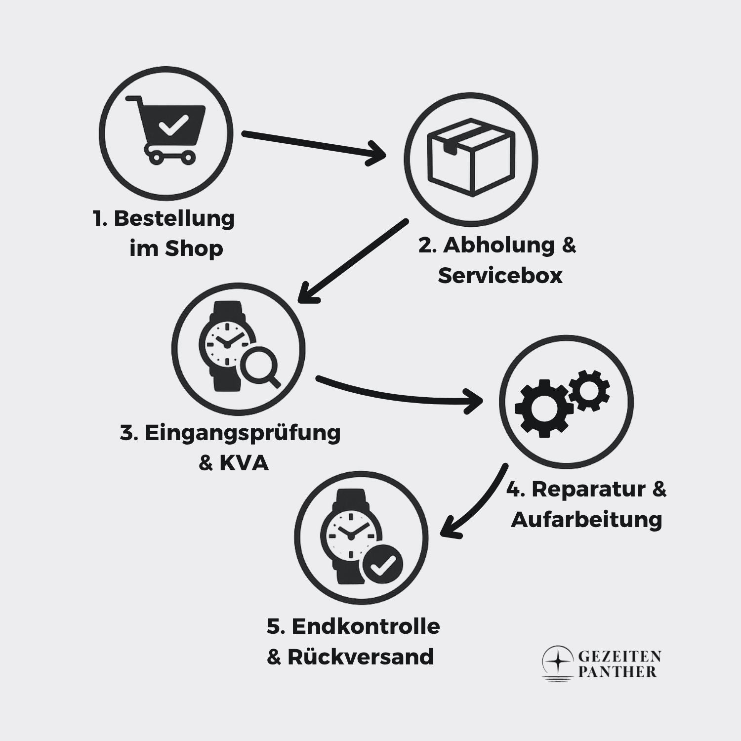 In den Servicekosten ist bereits alles enthalten, was du für eine fachgerechte Revision deiner Uhr brauchst – ganz ohne versteckte Kosten: